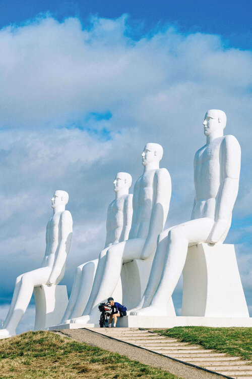 A contemplative break at the foot of the statue Man meets the Sea, a monumental sculpture by Sven Wiig Hansen just outside Esbjerg.