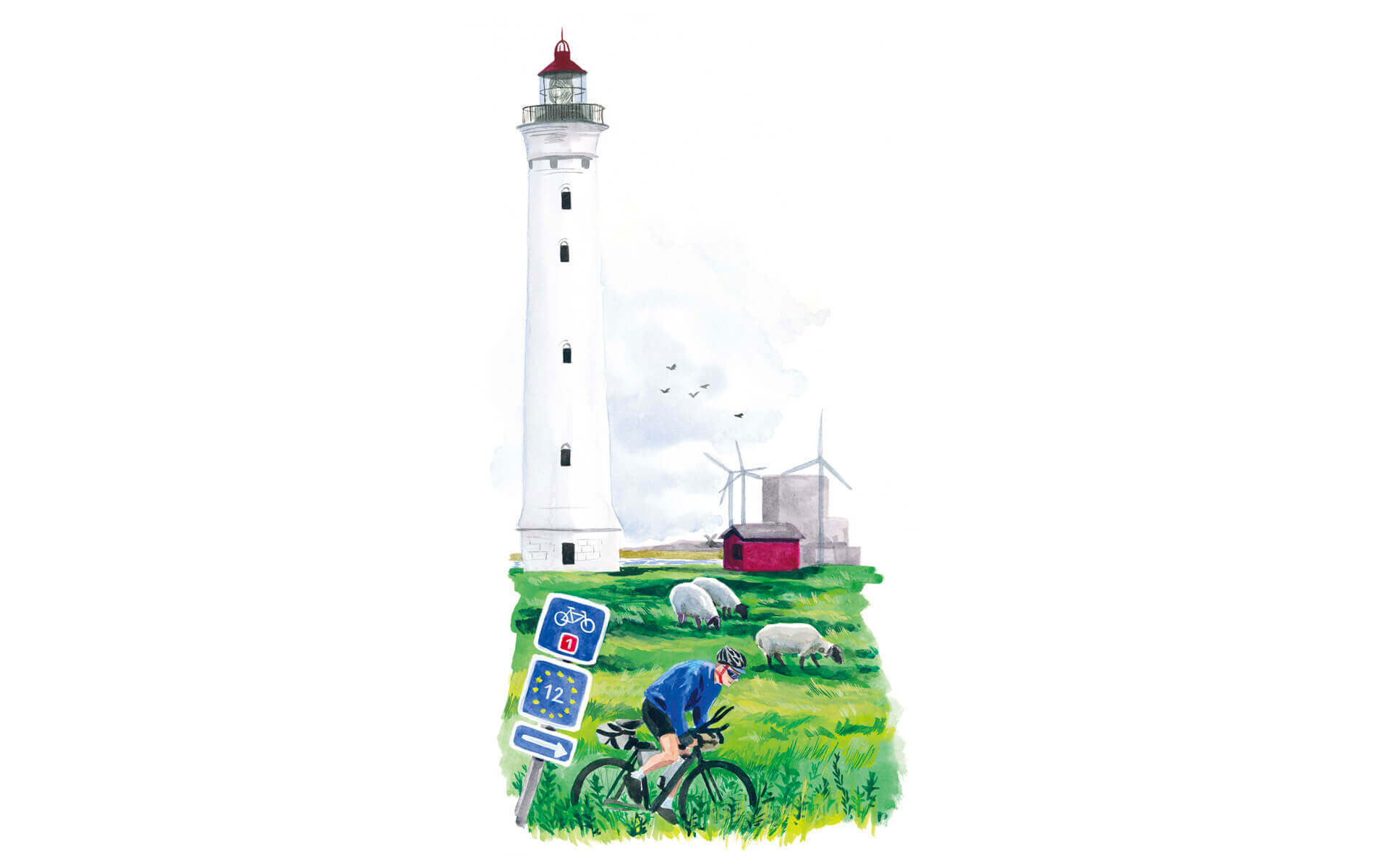 We can also choose to keep the bicycles and attendant accessories simple, knowing that we can always, anywhere, get spares in case of breakage. And also one can just go semi-autonomous, with just a helmet, a few things, a toothbrush. Only the minimum is needed to go ahead and enjoy simple pleasures, such as a celebratory dip in the North Sea for the two cyclists at the end of their journey on EuroVelo 12, behind the sand spit of the fishing village at Hvide Sande. “When we arrived, the water was reflecting the orange lights of the setting sun back at us. All we had to do was put down the bikes and throw ourselves into the waves.”